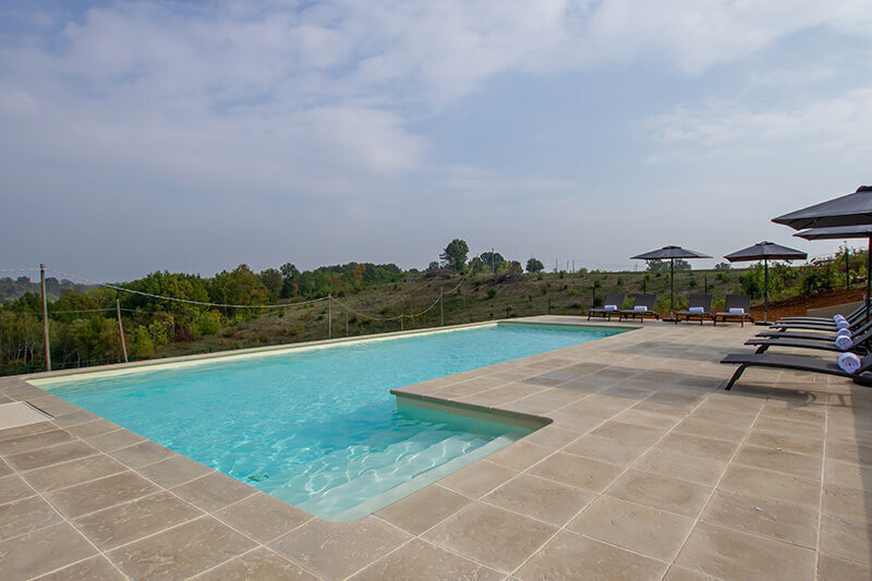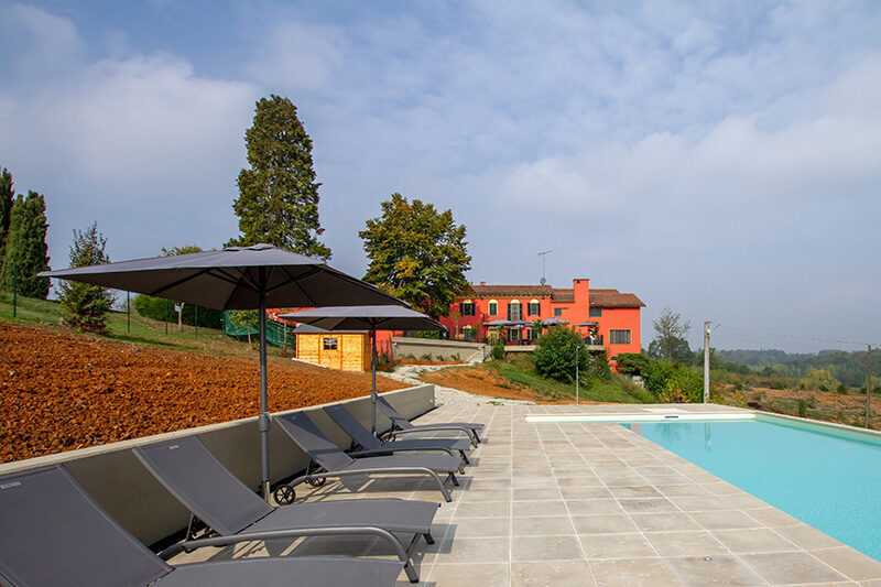 beheizter Pool mit Sicht auf die Ferienvilla im Piemont